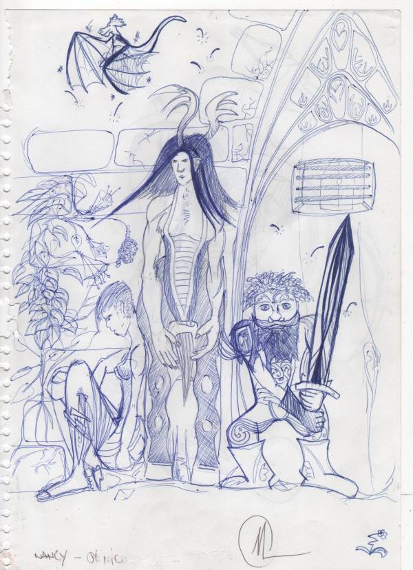 Le nain vous rétorque que vous ne pouvez être ami avec lui. Il s'énerve même d'un coup sec. Le centaure au bois de cerf souligne vos jambes du regard, alors que la femme aux oreilles pointues se ruine les yeux sur votre front plissé. En un seul mot, les trois compères vous disent : « Vous venez ? »
